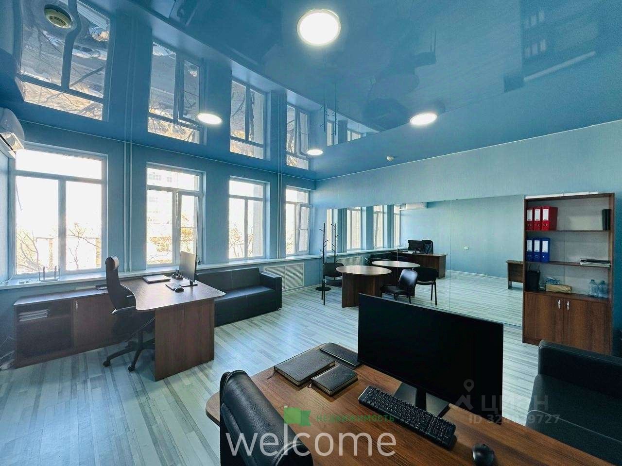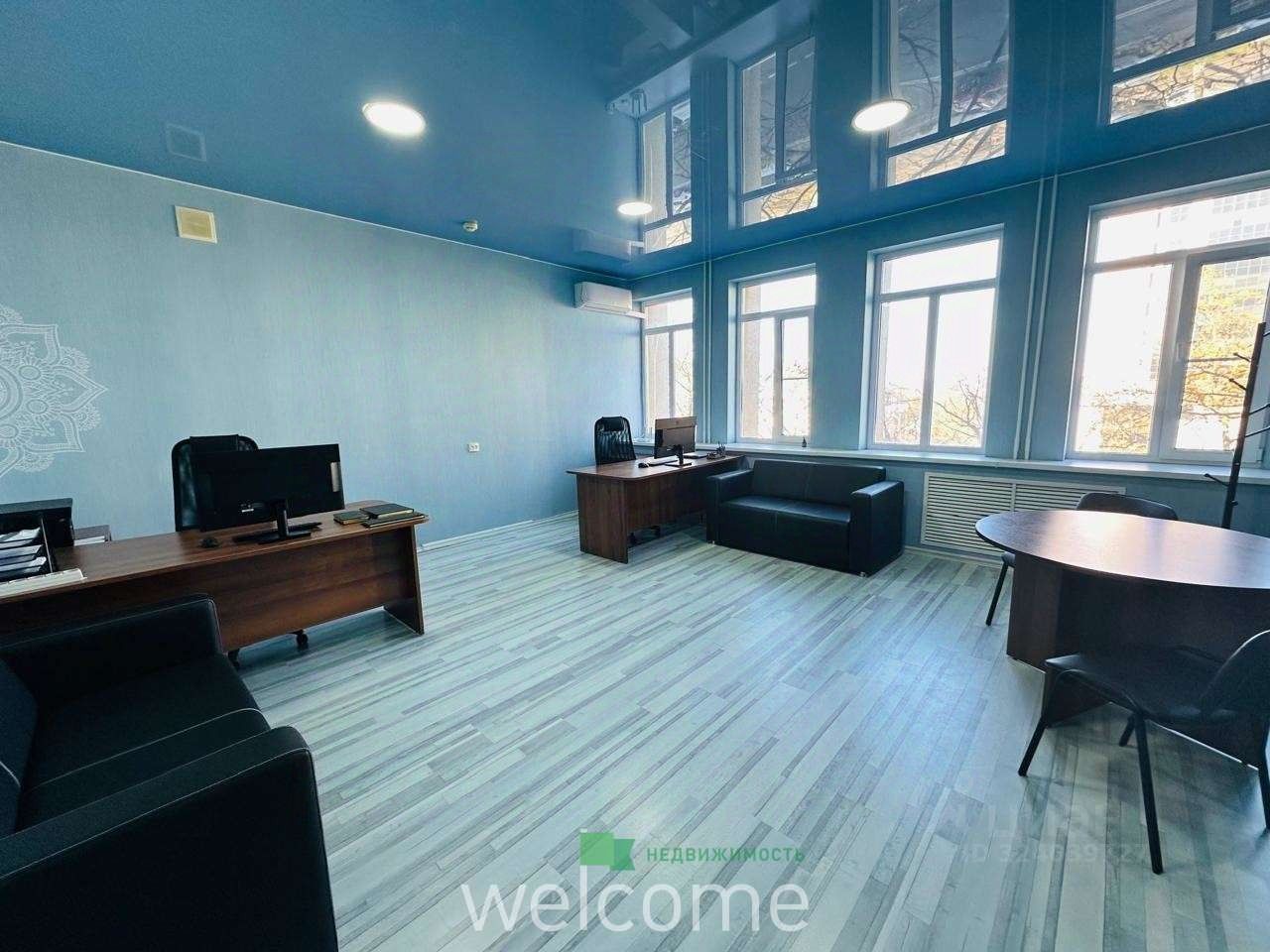 Просторный кабинет правильной квадратной формы с четырьмя окнами обеспечивает отличное естественное освещение. При необходимости, пространство легко трансформируется в два отдельных кабинета. Приятным бонусом станут низкие коммунальные платежи.